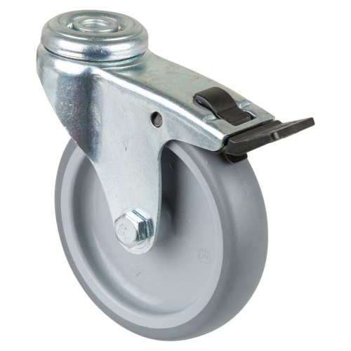 Kolo transportno gibljivo z zavoro in priključno izvrtino, termoplastična guma