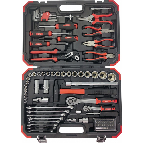 Kovček z orodjem vsebuje 95-delno garnituro ročnega orodja za različna montažna, servisna in vzdrževalna dela. Komplet vključuje orodje z 1/4" in 1/2" pogonom ter osnovna ročna orodja za širok spekter uporabe.