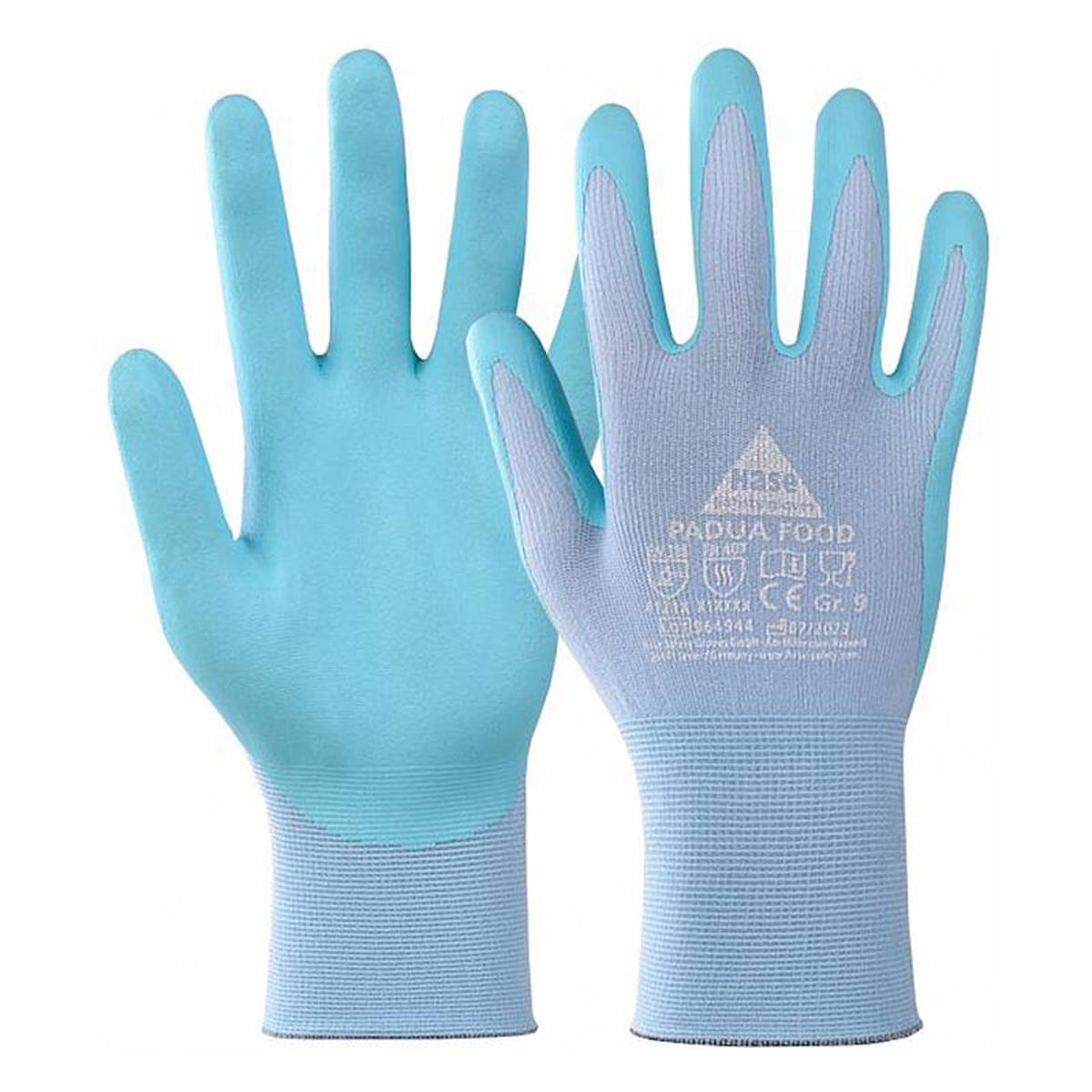 PADUA FOOD so visoko specializirane montažne rokavice, izdelane iz finega 15-gauge najlonskega pletiva z nitrilno penasto prevleko na dlani in prstih. Namenjene so uporabi v živilski industriji, saj izpolnjujejo zahteve Uredb (ES) 1935/2004 in EU 10/2011 glede stika z živili.