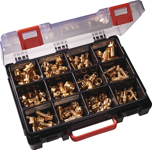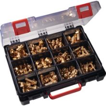 Praktična sortirna škatla z 120 medeninastimi deli. Idealna za delavnice in montažo.