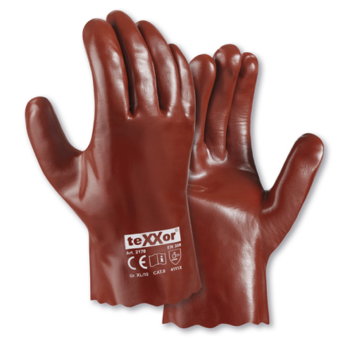 TEXXOR 2170, VEL.10, ROKAVICA ZA KEMIKALIJE, PVC, RDEČE BARVE.PODLOŽENA Z BOMBAŽEM, DOLŽINE 27 CM, KAT.2, EN 388-4111X
